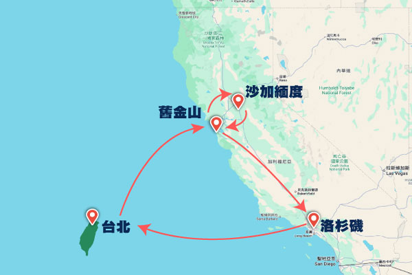台北TPE→舊金山SFO (市區觀光)→141km→沙加緬度Sacramento