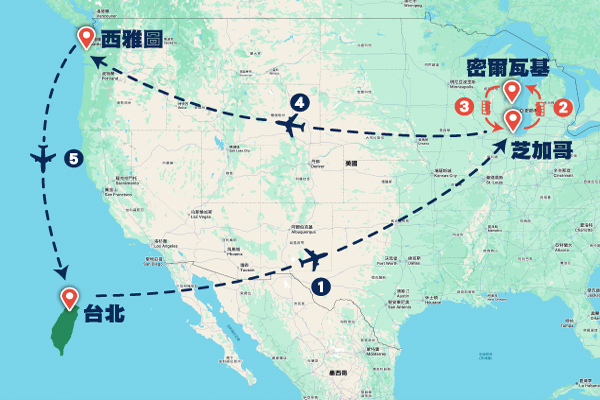 芝加哥→147 km→密爾瓦基Milwaukee (釀酒人比賽、釀酒工廠導覽)→47 km→芝加哥