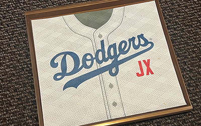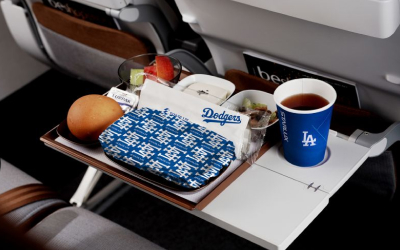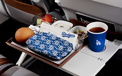 洛杉磯回台北的班機是星宇航空的道奇主題航班,不但登機時會在機艙螢幕畫面看到道奇球場,許多被餐飲相關備品也都有球隊的標誌,喜歡收藏的人千萬不要錯過。噢!對了,記得找空服員索取撲克牌喔!
